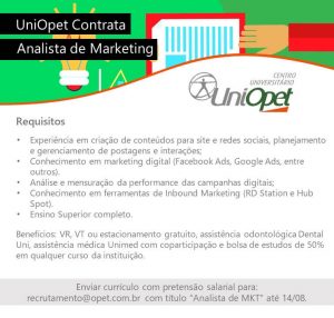 UniOpet contrata Analista de Marketing. Vaga para trabalhar em Curitiba.