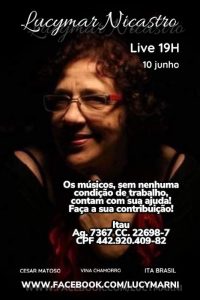 Teremos live da grande cantora Lucymar Nicastro nesta quarta-feira, dia 10 de junho, às 19h, no facebook: www.facebook.com/lucymarn1