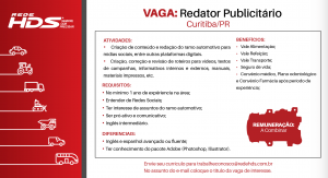 Rede HDS contrata Redator Publicitário. Vaga para trabalhar em Curitiba.