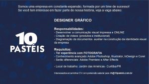 Interessados enviem currículo com portfólio e pretensão salarial para analistamkt@10pasteis.com.