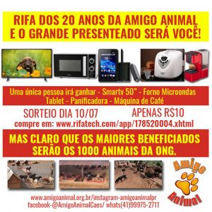 Amigo Animal lança mais uma rifa emergencial Ação entre Amigos dos Animais da Amigo Animal, enquanto as autoridades estadual e municipal não liberam a realização dos eventos bingos em clubes.
