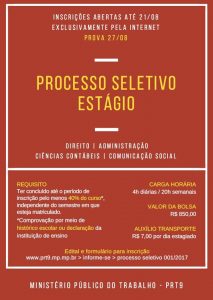 A Procuradoria Regional do Trabalho da 9ª Região está com inscrições abertas para estudantes dos cursos de Direito, Comunicação Social, Administração e Ciências Contábeis. Vagas para estagiar em Curitiba.