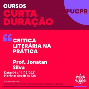 O jornalista, crítico literário e escritor Jonatan Silva ministrará, nos dias 4 e 11 dezembro, a primeira edição do curso Crítica Literária na Prática, pela PUCPR. Serão oito horas dedicadas à prática da escrita para a crítica de arte, sobretudo, a literária. Buscando investigar os caminhos para o novo crítico, Silva apresentará aos estudantes os elementos fundamentais da construção do texto crítico por meio de uma imersão no processo prático.