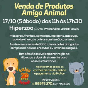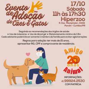Campanha de adoção Amigo Animal neste sábado, dia 17 de outubro, das 11h às 17h, na HiperZoo, na Rua Desembargador Westphalen, 3448, no bairro Parolin, em Curitiba. Das 11h às 17h30. Evento de adoção + vendas de produtos da ONG.