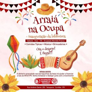 Neste sábado, 09 de julho, às 15h, vai rolar a festa julina da ocupação Marielle Franco e também a tão esperada inauguração da Biblioteca Comunitária, localizada na Cozinha Solidária do MTST Paraná na Rua Arlindo Cordeiro, 15, bairro Tatuquara, em Curitiba-PR. Festança boa, com muita comida típica, música tradicional e brincadeiras. Entrada livre.